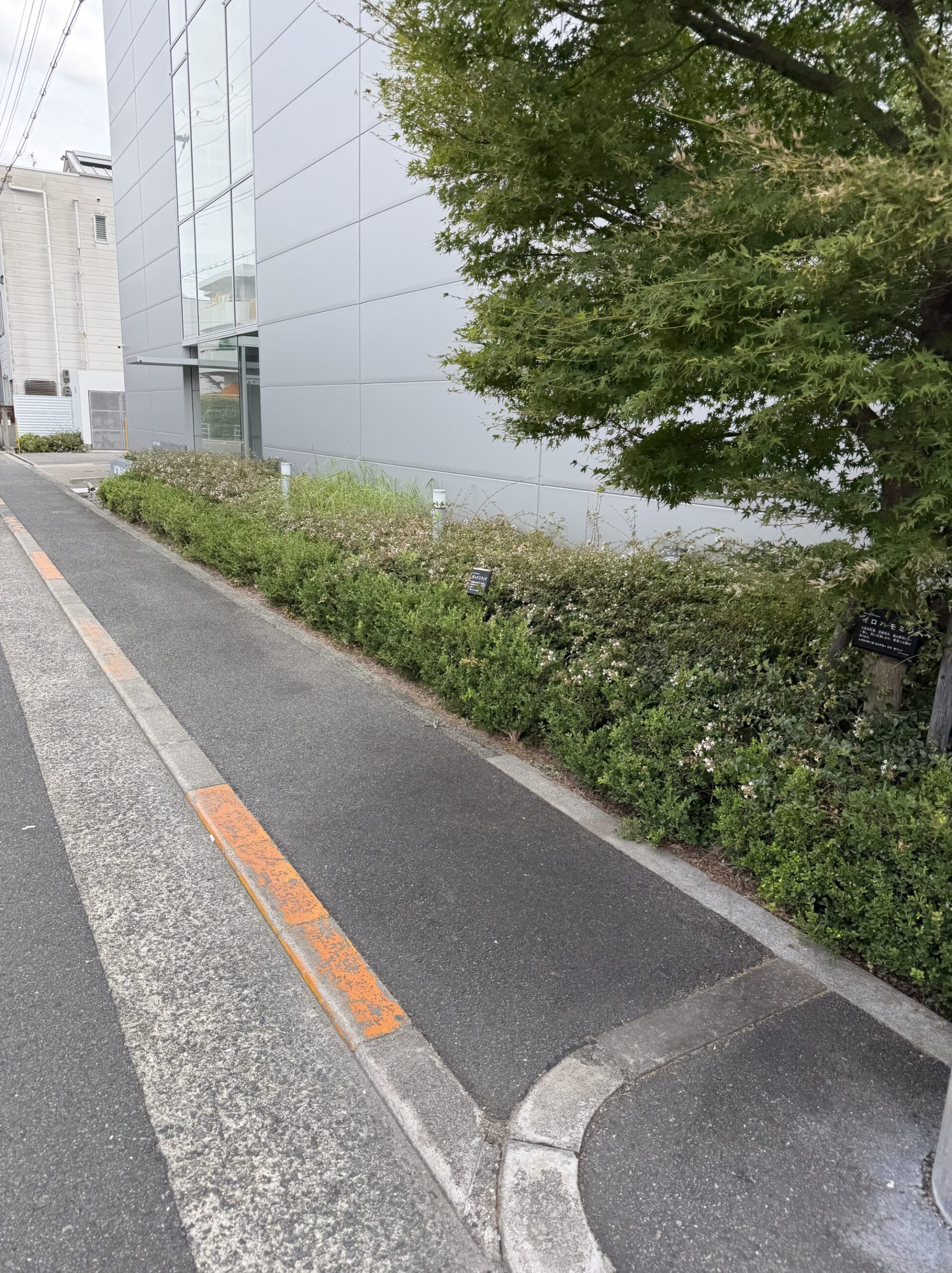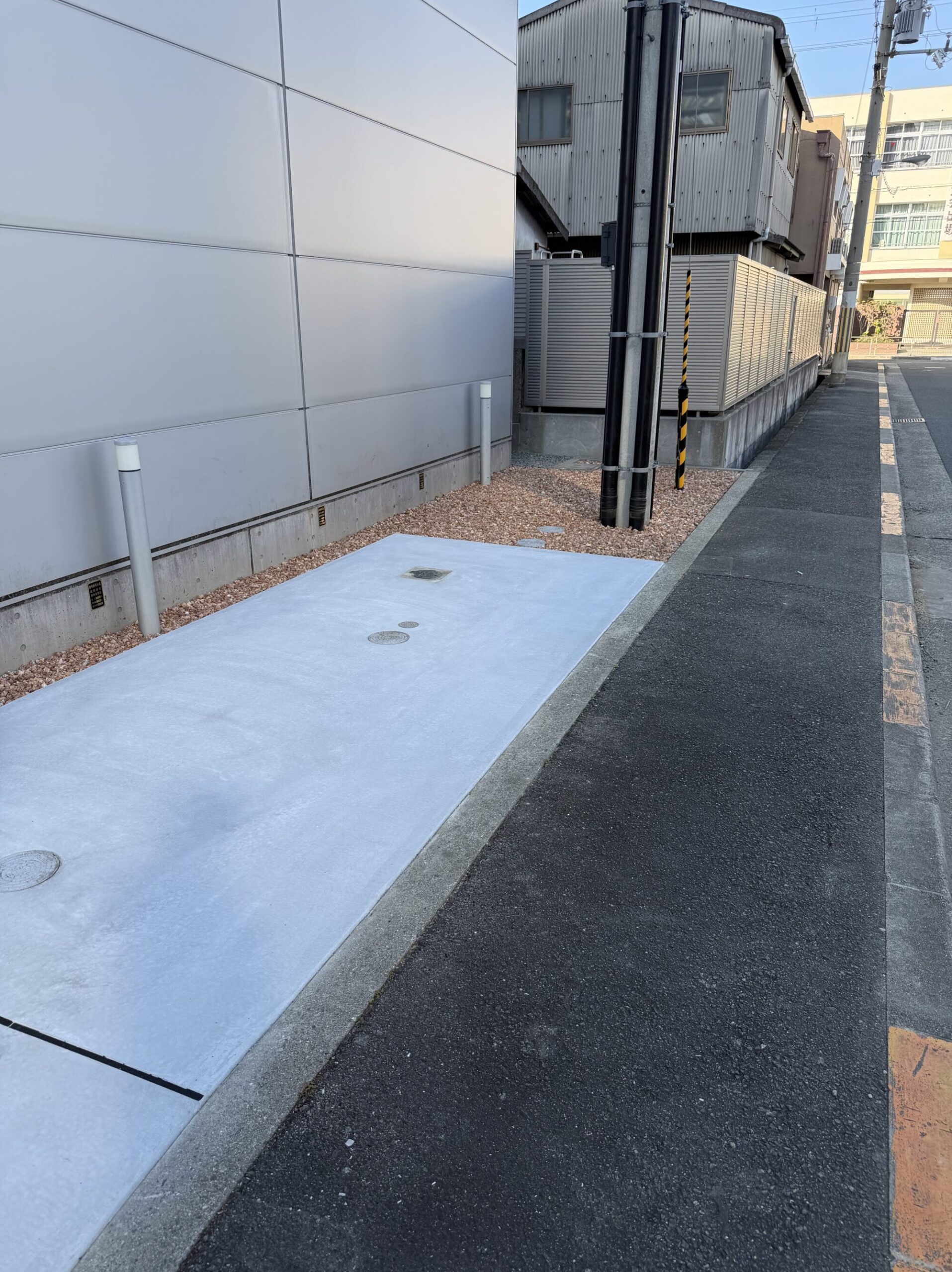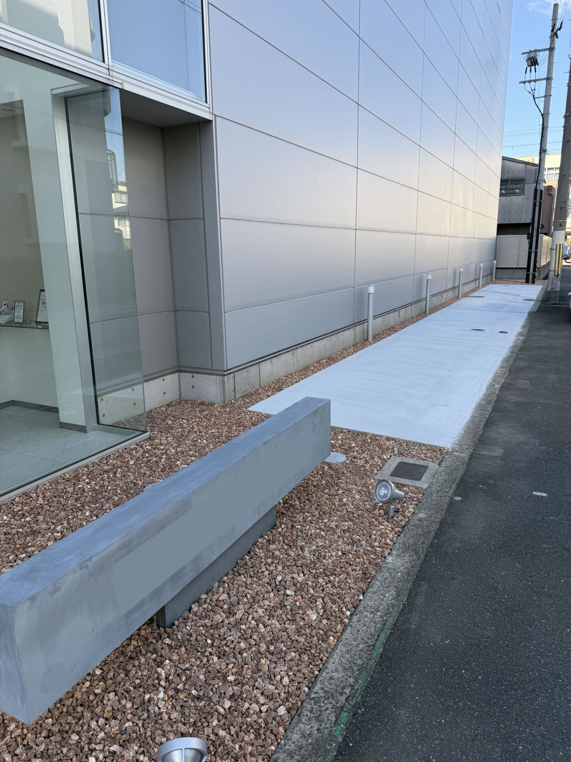 通路部分はコンクリート舗装を採用し、歩きやすさと見た目の明るさを確保しました。段差や傾斜も微調整し、来客や従業員の方が安心して歩ける、安全性の高い動線になっています。