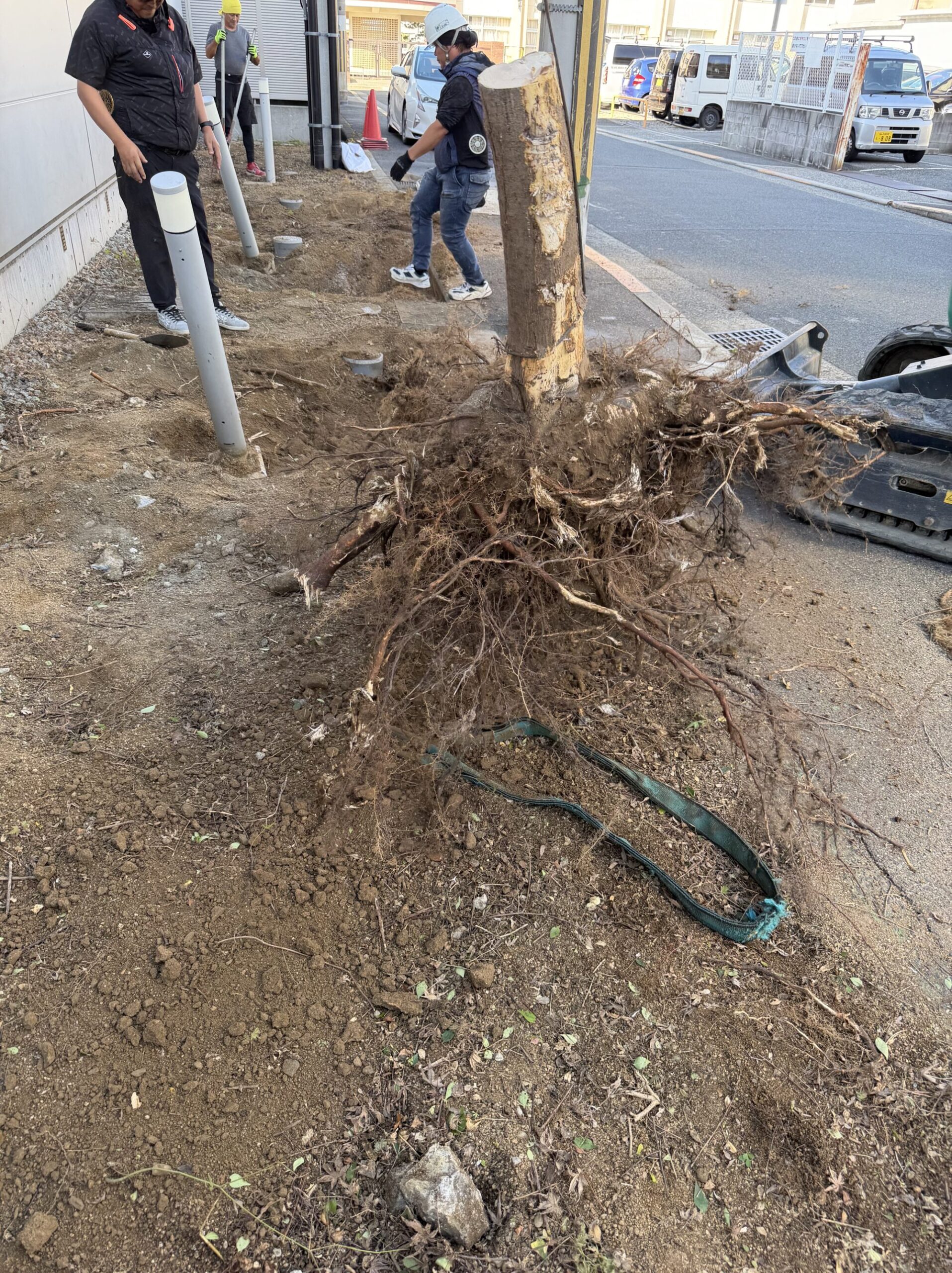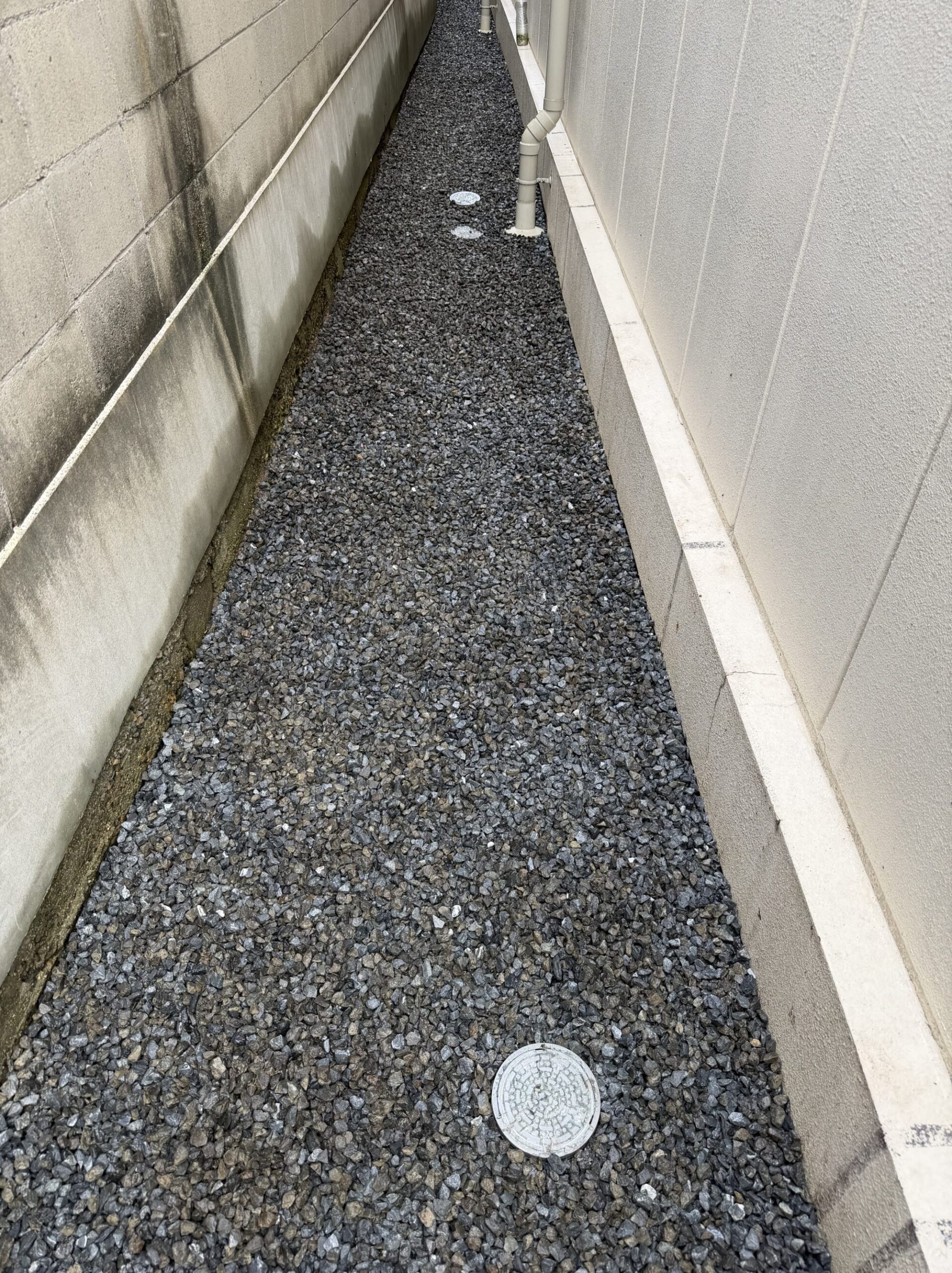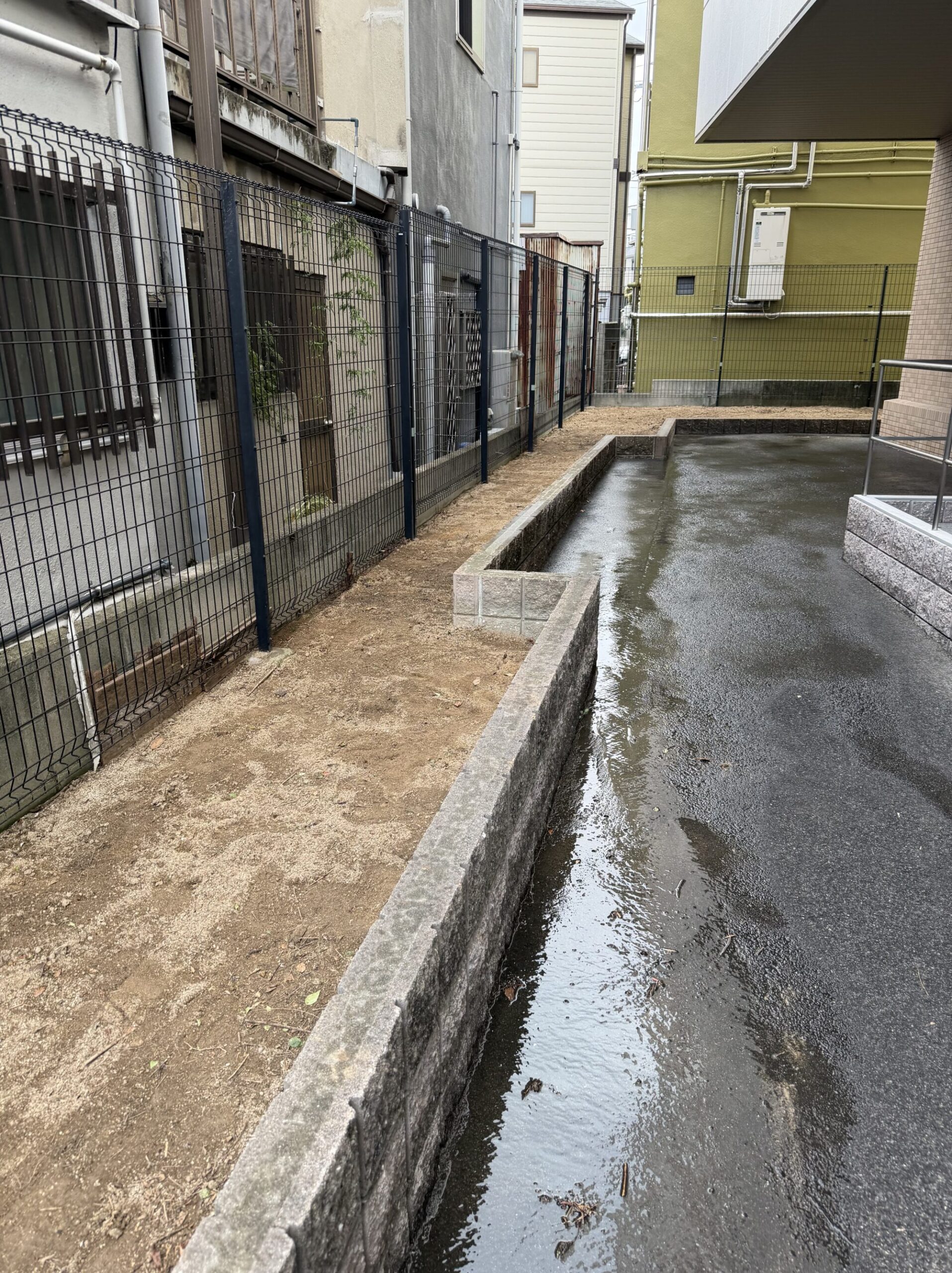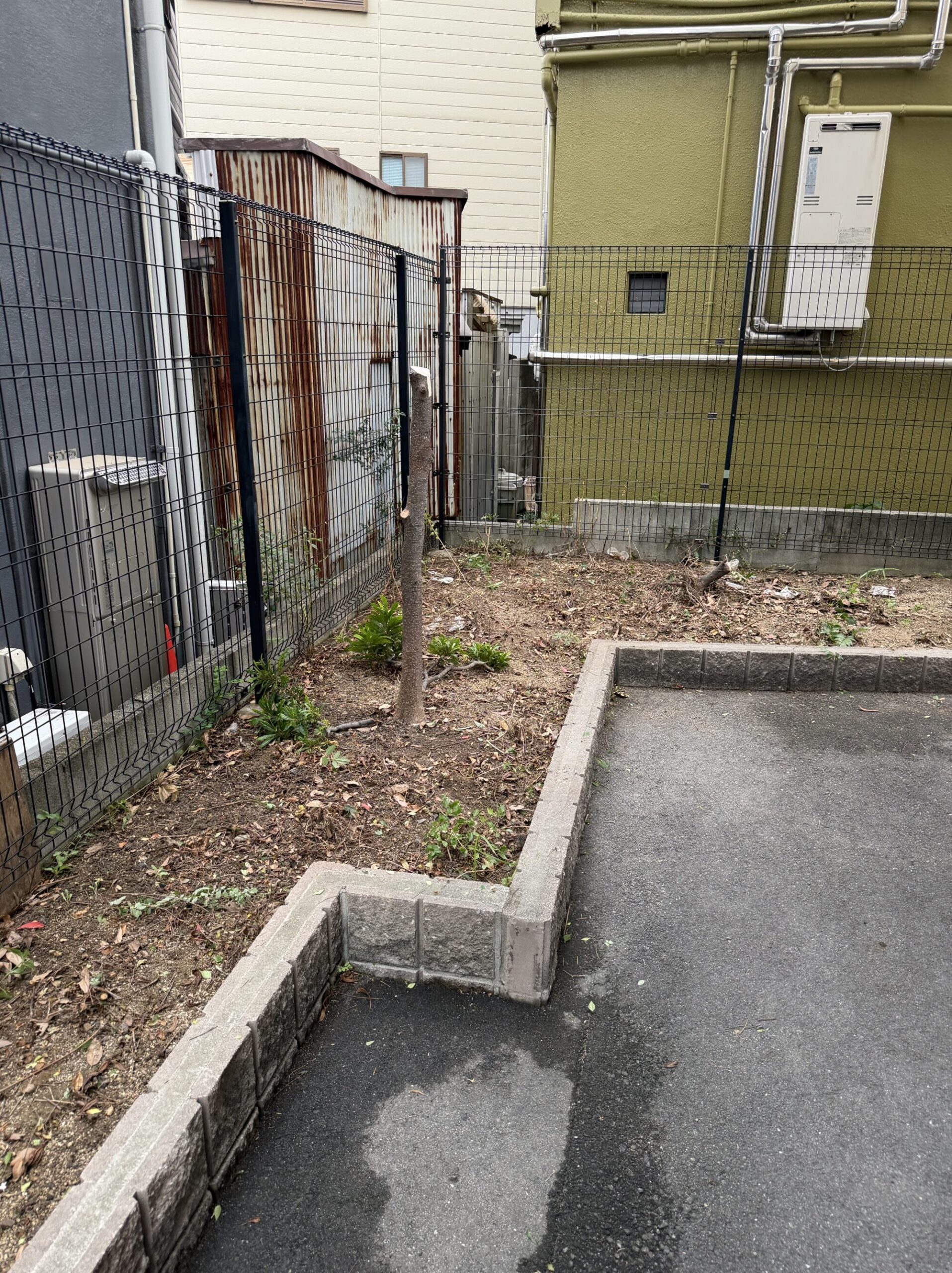 まずは、建物周辺にあった植込みをすべて撤去。土の入れ替えや根の掘り起こしも行い、雑草が生えにくい状態に整えました。長年そのままだった部分も多かったため、撤去後はすっきりとした広いスペースが生まれ、全体の印象が大きく変わりました。