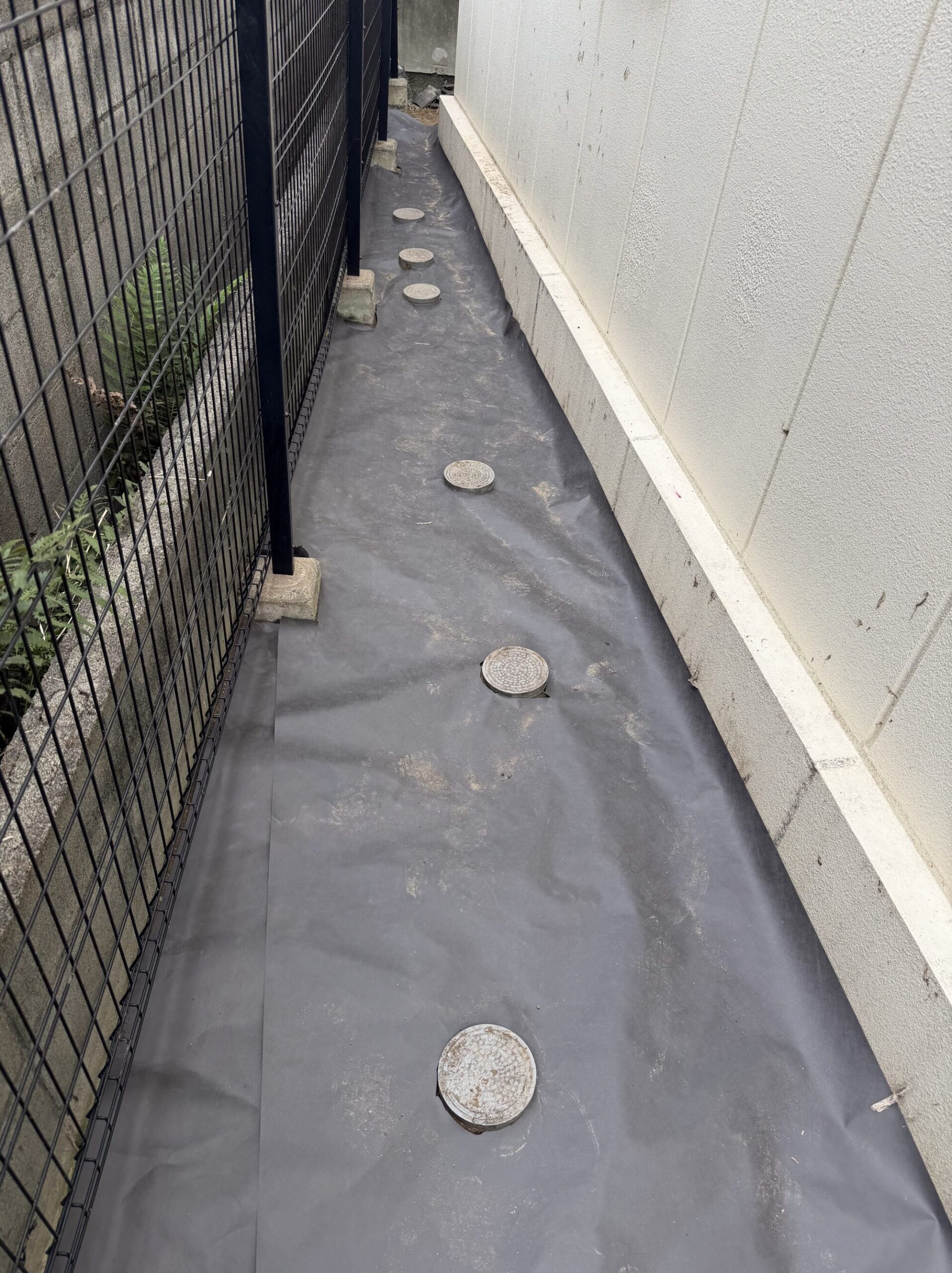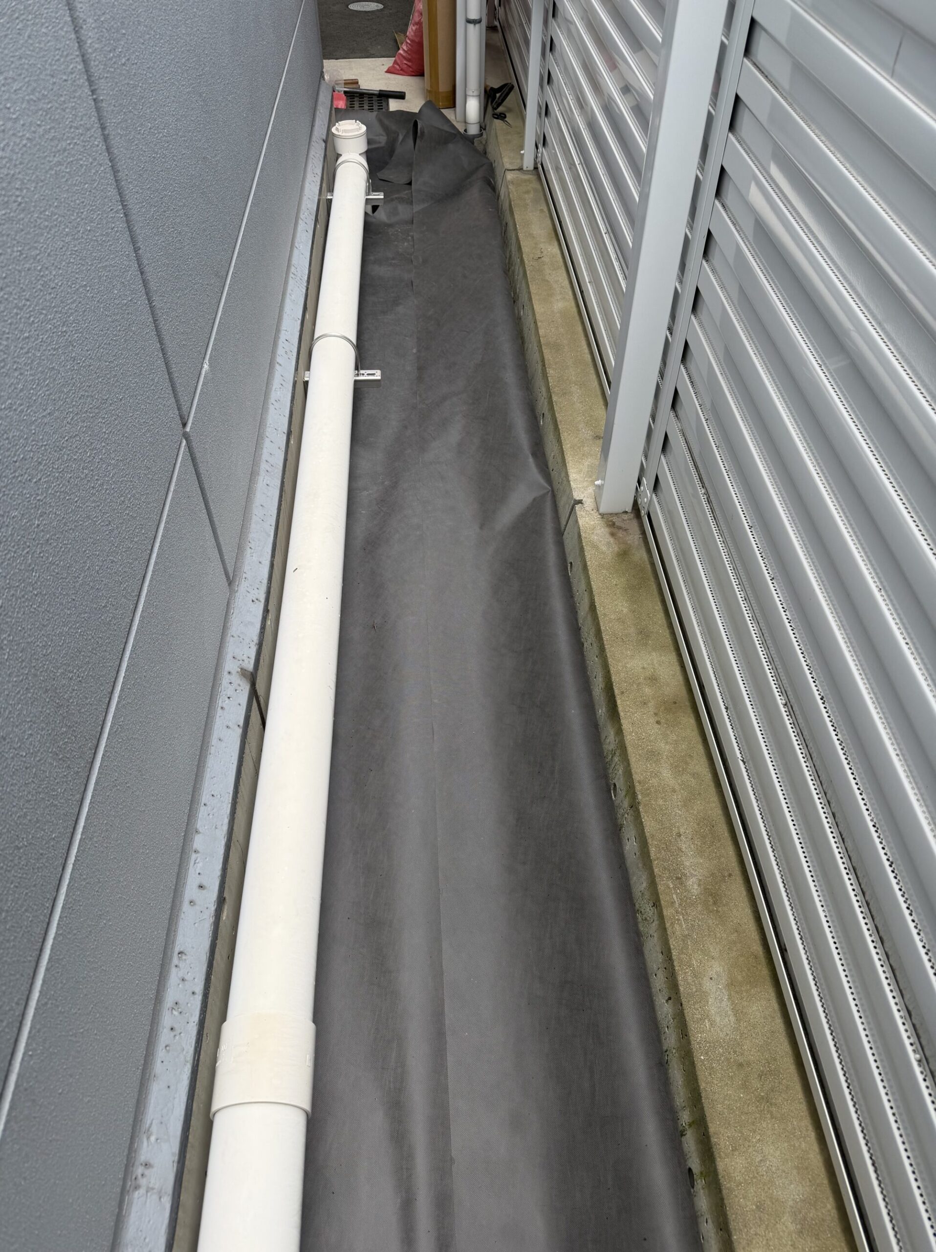 次に、防草対策として防草シートを敷き込み。耐久性の高いシートを使用し、端部の固定や重なり幅にもこだわって施工しています。その上から明るい色味の砂利を敷き、建物のシャープなデザインとよくなじむ、清潔感のある外観に仕上げました。砂利の音で防犯性も少しアップするなど、さりげないメリットもあります。